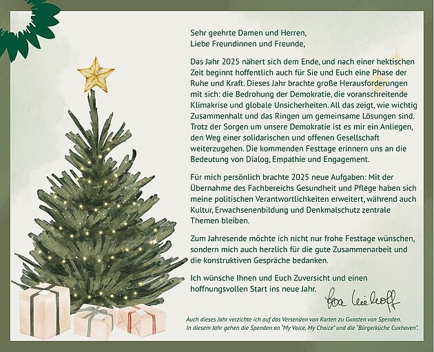 Mit meiner diesjährigen Weihnachtskarte wünsche ich allen Bürgerinnen und Bürgern, Freundinnen und Freunden ein frohes und friedvolles Weihnachtsfest, erholsame Feiertage und einen guten Start ins Jahr 2026